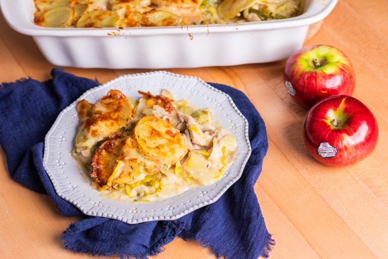 Réconfortant, savoureux et facile à préparer, ce gratin de poulet aux poireaux, pommes et cheddar est le plat parfait pour les soirs où l’on a envie de bien manger sans se compliquer la vie. La douceur des pommes du Québec équilibre à merveille le goût délicat des poireaux et le fondant du cheddar, pour un repas complet qui plaît autant aux petits qu’aux grands. Un classique revisité, chaleureux et plein de goût.